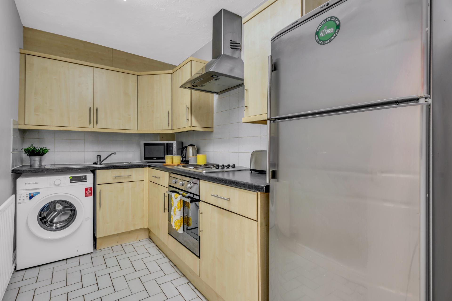 The fitted kitchen includes stainless steel oven, hob, extractor, and washing machine. The large double bedroom comes complete with double bed and associated furniture, making the flat suitable for a couple or student sharers.