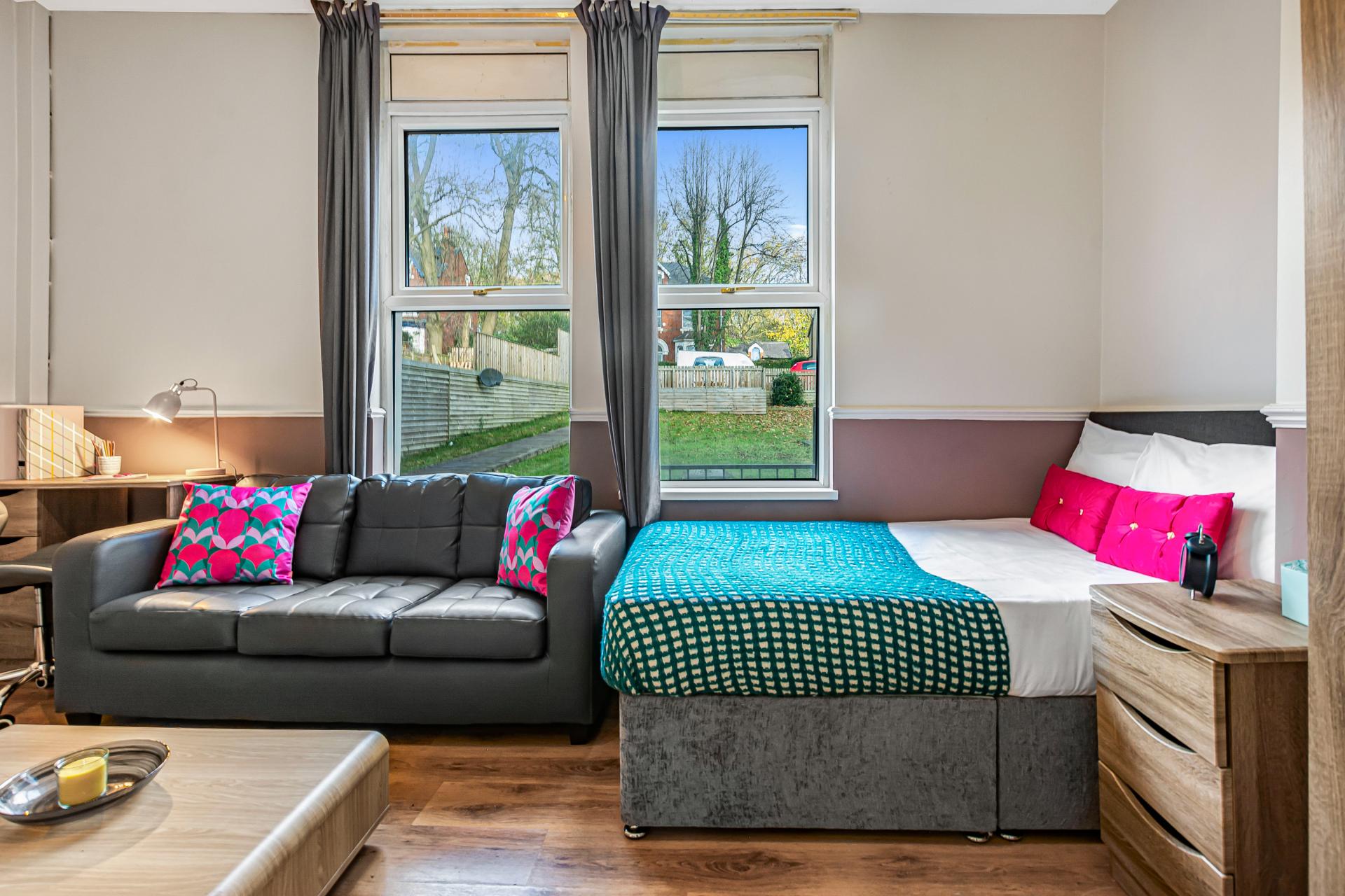 Ground floor studio apartment newly refurbished complete with laminate flooring and redecorated throughout. This spacious studio is fully furnished with double bed, wardrobe, desk with chair, tv stand and sofa. Leading off from the main room is a fully fitted modern kitchen including washing machine, under counter fridge/freezer and oven with hob and personal shower room with WC and wash basin. Within walking distance of Kirkstall Leisure Complex.